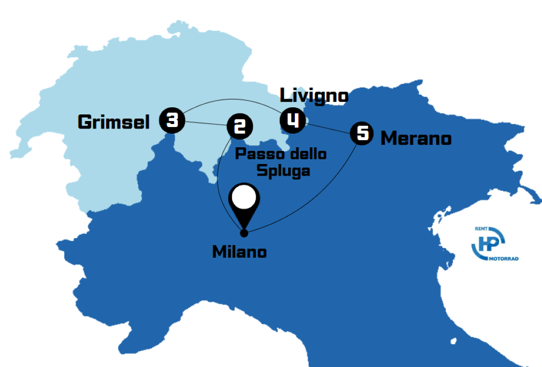 Día 2: Milán - Paso Spluga 206 km / 128 millas (Hotel incluido, recogida de la moto por la mañana)