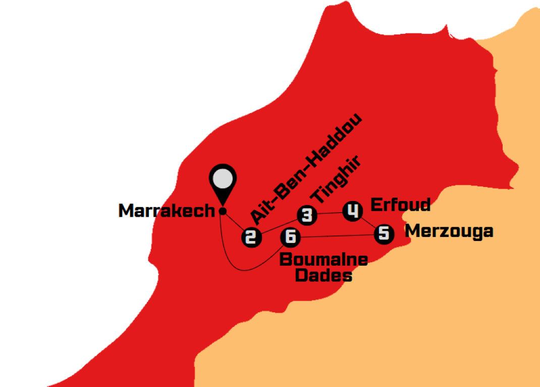 Una fantástica ruta de 8 días que nos llevará a descubrir la parte de Marruecos a menudo olvidada por los tours clásicos, pero tan rica en cultura, sabores antiguos, todos los ingredientes que hacen la diferencia entre "viajar" y "hacer turistas" ": altas montañas, profundos valles, antiguas Kasbahs y legendarios Ksars, pequeños pueblos con casas de barro, interminables palmerales, oasis y dunas.