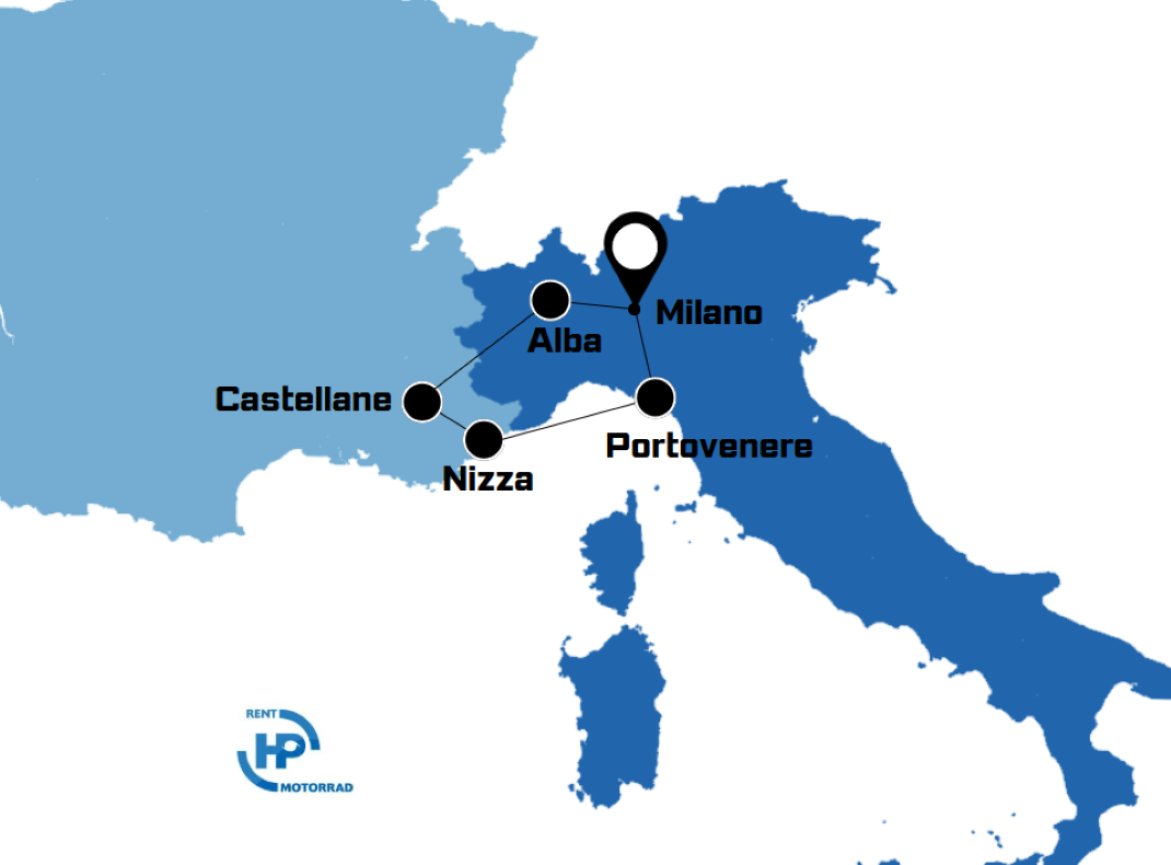 Inizia in Piemonte, ricca di cultura e storia. Prosegue attraverso Liguria per entrare in Francia: Col de Turin e Gorges du Verdon, dando il tempo per esplorare Monaco, Cannes e Saint Tropez. Rientro in Italia attraversando le Cinque Terre.