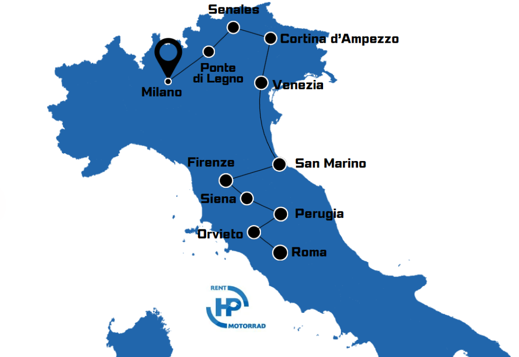 Questo nuovo tour si chiama Italian Top, di fatto il migliore tra i migliori, dal momento che ci farà conoscere alcune delle meraviglie del Bel Paese. Cominceremo il nostro tour da Milano e ci dirigeremo subito verso le montagne, le bellissime Alpi, al famoso passo dello Stelvio, sogno di ogni motociclista coi suoi 88 tornanti. Entreremo poi nel cuore delle Dolomiti, montagne dal colore unico rosa-arancio, altra meta molto ambita dai motociclisti. Arriveremo quindi a Venezia, città unica nel suo genere costruita sull'acqua, poi a Firenze, Pisa, Siena, Assisi, per arrivare finalmente a Roma, la capitale d'Italia. Un percorso spettacolare che ci farà conoscere tante meraviglie del Patrimonio dell' Unesco.